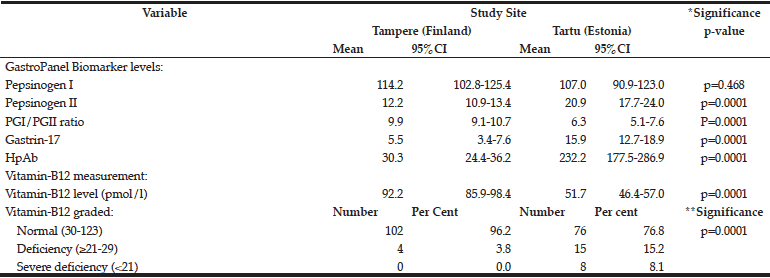 The mean levels of the GastroPanel biomarkers and vitamin-B12 are summarized in Table 3. The levels of all but PGI were significantly different in Tampere and Tartu (p=0.0001). Consonant with more frequent HP infection in Tartu than in Tampere (52.4% vs. 25.4%), PGII (marker of inflammation) and HP Ab levels were higher in Tartu. PGI/PGII ratio was lower but G-17 was higher in Tartu, both reflecting the prevalence of AGC.