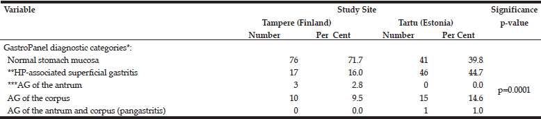 The data collected for GastroPanel test are markedly different in the two cohorts (Table 2). None of the subjects in Tartu had HP eradication been performed as compared to 19.4% of those in Tampere (p=0.0001). PPI use was significantly more rare in Tartu than in Tampere, as was the use of NSAIDs, antibiotics, B12-vitamin supplementation, and previous gastroscopy (all; p=0.0001).