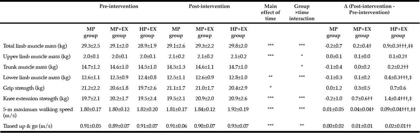 Mean value ± Standard deviation; Two-way ANOVA by time (Pre- and Post-intervation period) × group (HP+EX, MP+EX, MP group)* p <0.05, ** p <0.01,*** p <0.001; One-way ANOVA and post-hoc by Tukey test, Significant difference with MP group: †p <0.05, ††p <0.01, †††p <0.001, Significant difference with MP+EX group: ‡p <0.05, ‡‡p <0.01