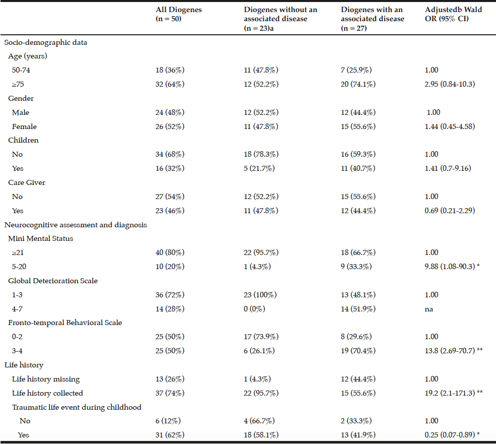 Socio-demographic characteristics. Multiple logistic regression analysis (Table 2) revealed that Diogenes subjects with an associated disease did not differ significantly from those without an associated disease.