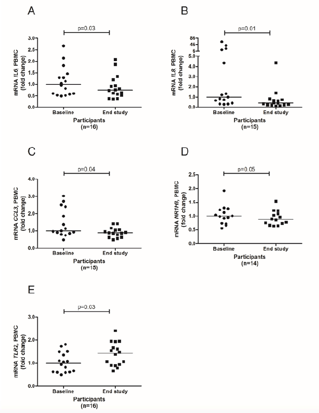 No differences were observed from baseline to after the intervention in the serum level of IL6 or the plasma level of CRP (Table 2). Serum levels of IL8 and CCL3 were also measured, but were not detectable (not shown).