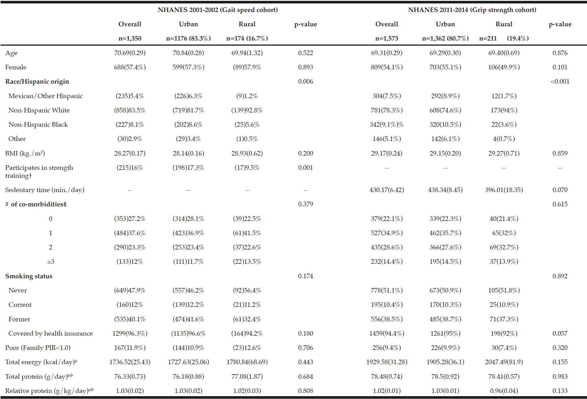 Participant baseline characteristics for each cohort are presented in Table 1. The proportion of participants residing in rural areas was 16.7% and 19.4% in the Gait Speed and Grip Strength cohorts, respectively. Urban and rural participants were similar in age, sex, body mass index and number of comorbidities. Race/Hispanic origin and participation in strength training (in the Gait Speed cohort) were the only baseline characteristics exhibiting statistically-significant urban-rural differences. Total energy, total protein and protein adjusted for body mass (relative protein) intakes were similar between urban and rural participants, in both cohorts.