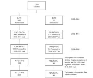 At baseline and during extended post-intervention follow-up (12-13 years later), participants were asked about daytime sleepiness: “How often do you feel excessively(overly) sleepy during the day.” Responses included never(1 day/month or less), sometimes(2-4 days/month), often(5-15 days/month), and almost always(16-30 days/month). Baseline and extended follow-up reports of daytime sleepiness were each and classified into three groups: 1) never, 2) sometimes, and 3) often or almost always.