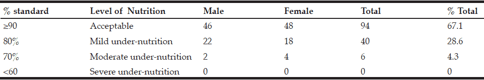 The body mass index of the aged were calculated as weight of each individual in kg divided by the square of the height in metres, values were then compared to WHO (26) reference standards.