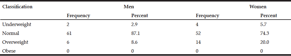 About 74% of the women were within the normal range of BMI, 20% were overweight while 5.7% were underweight. Among the men, however, about 87% had healthy BMI range, 8.6% were overweight while only 2.9% were found to be underweight. Nutrient intake analysis shown in Table 5 indicated that the mean intake of energy (2044 Kcal/day) carbohydrate (388.3g), protein (27.7g) and fat (42.2g) for men was significantly (p<0.05) higher than that